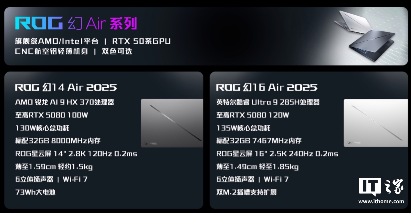 IT之家 1 月 7 日消息,在今天进行的 CES 2025 ROG 新品发布会上,华硕还官宣了国行版 2025 款 ROG 幻 14/16 Air 笔记本,相比海外版区别就是取消了 RTX 5090 显卡选项。