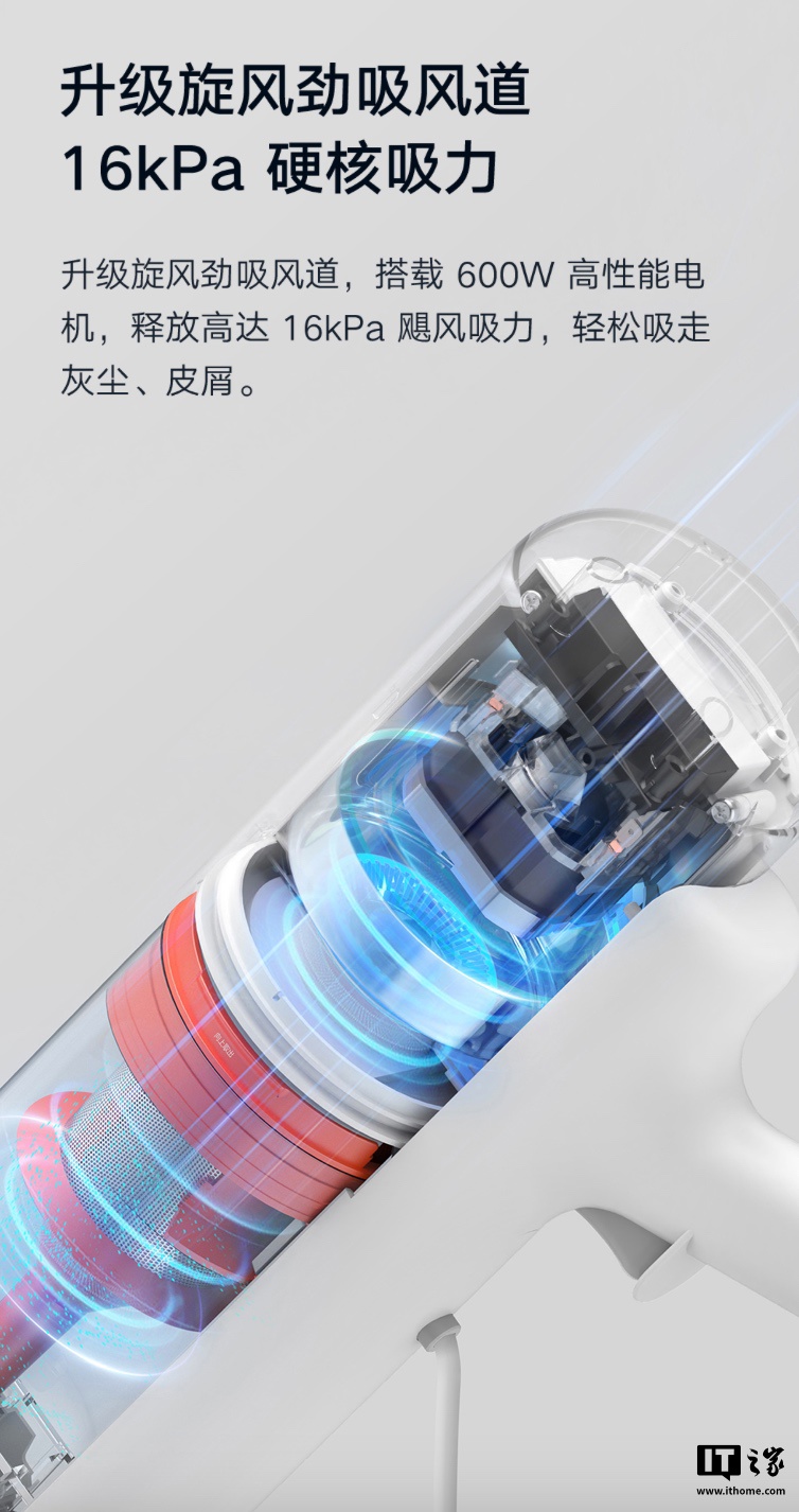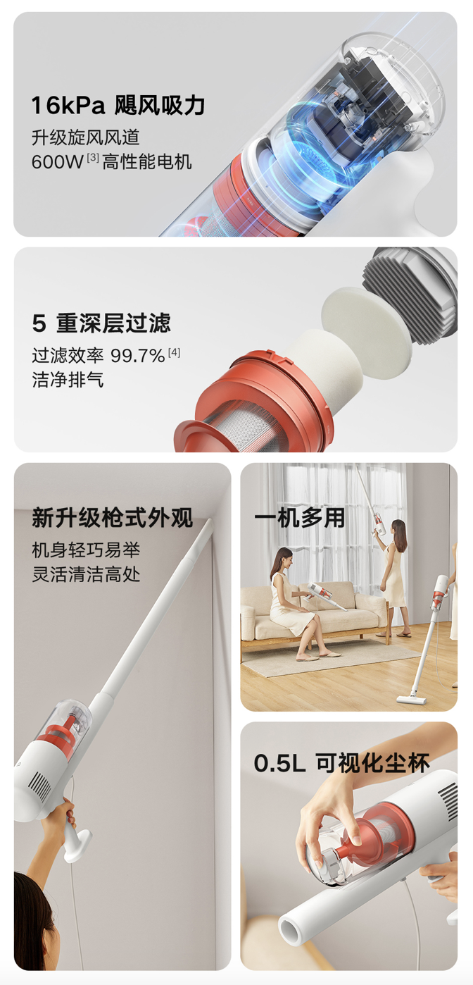 这款吸尘器搭载 600W 旋风电机,拥有 16kPa 吸力,配备 5 重深度过滤,旋风气流产生强大离心力,尘气瞬速分离,再通过针孔钢网、过滤棉、滤芯层层过滤灰尘和有害物质,防止回流,预防二次污染,官方称整机过滤效率 99.7%。