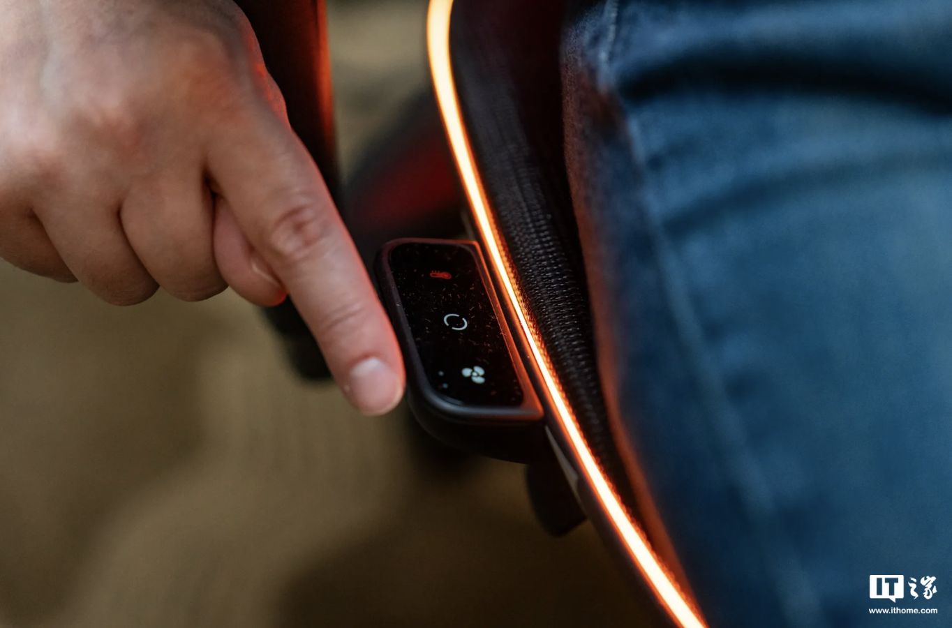 该椅子配备 RGB 灯,同时在椅子一侧带有按钮,用户可以直观点击按钮调节制冷制热,在制热时椅子的 RGB 灯会呈现红色暖光,在制冷时椅子的 RGB 灯会呈现蓝光。