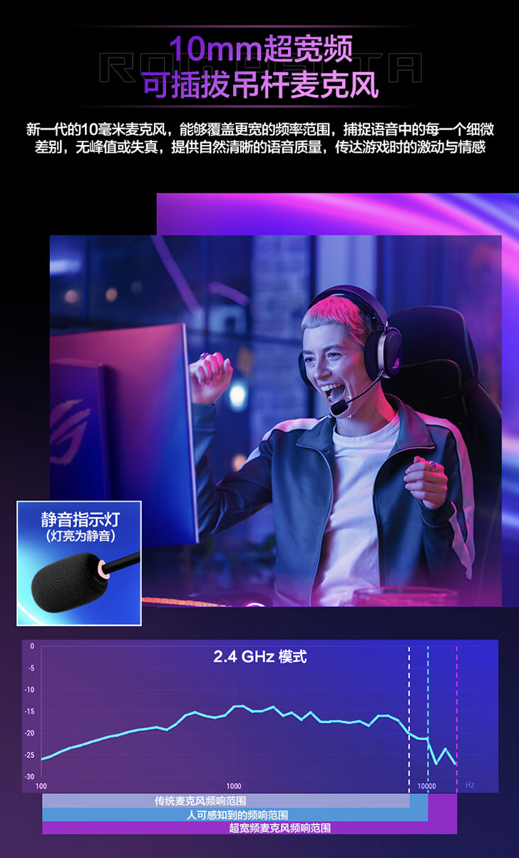 IT之家获悉,这款耳机配备 50mm ROG 镀钛振膜,号称音质经过特殊调教,宽频响应范围 20Hz-20KHz,配有 10mm 超宽频吊杆麦克风,同时支持 SpeedNova 无线技术,号称在 2.4GHz 下至高可以使用 70 小时、在蓝牙下至高可以使用 90 小时。