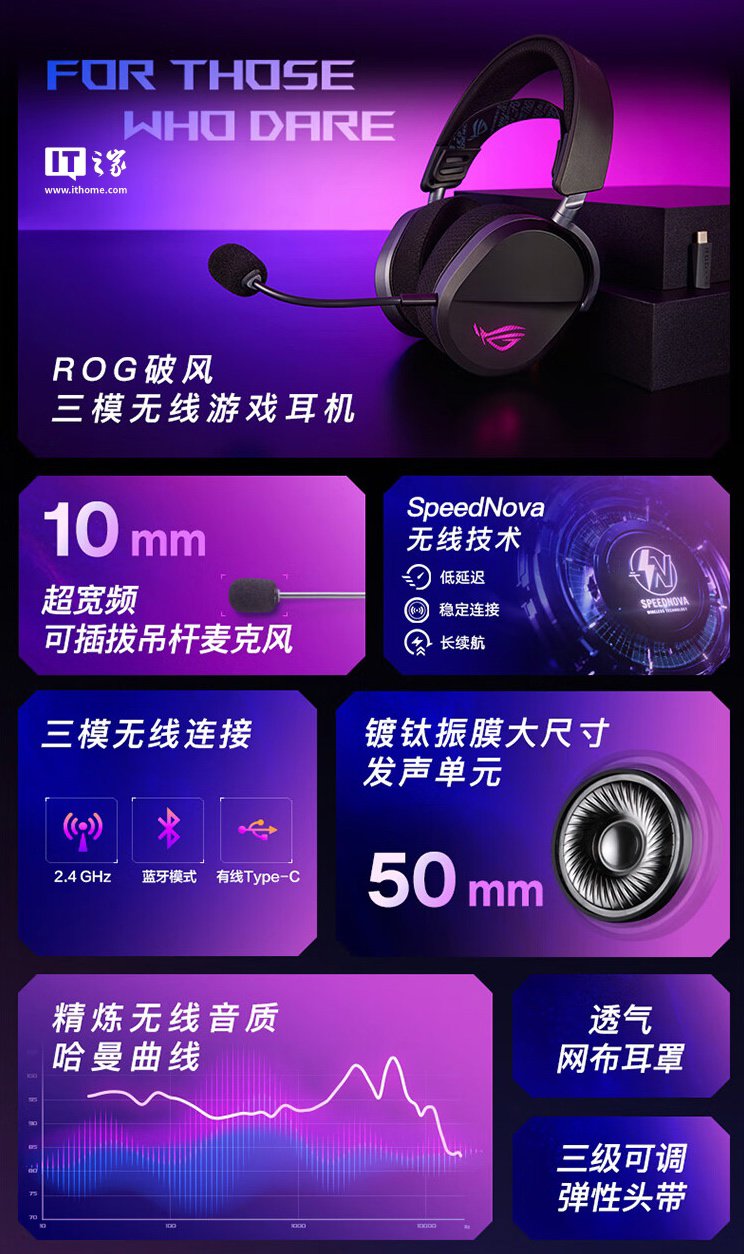IT之家 1 月 7 日消息,华硕宣布旗下 ROG 破风头戴式三模电竞耳机将于 1 月 13 日 20:00 首销,这款耳机主打“三级可调弹性头戴”、“透气网布耳罩”、“50mm 动圈”,定价为 799 元。