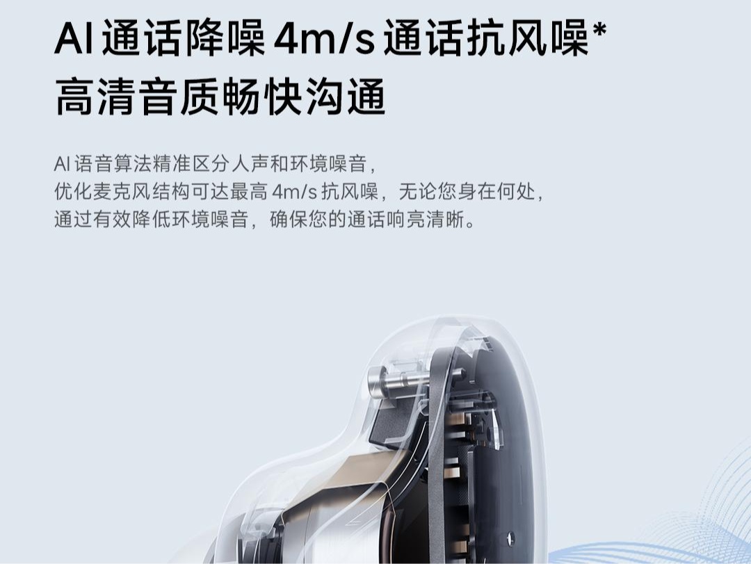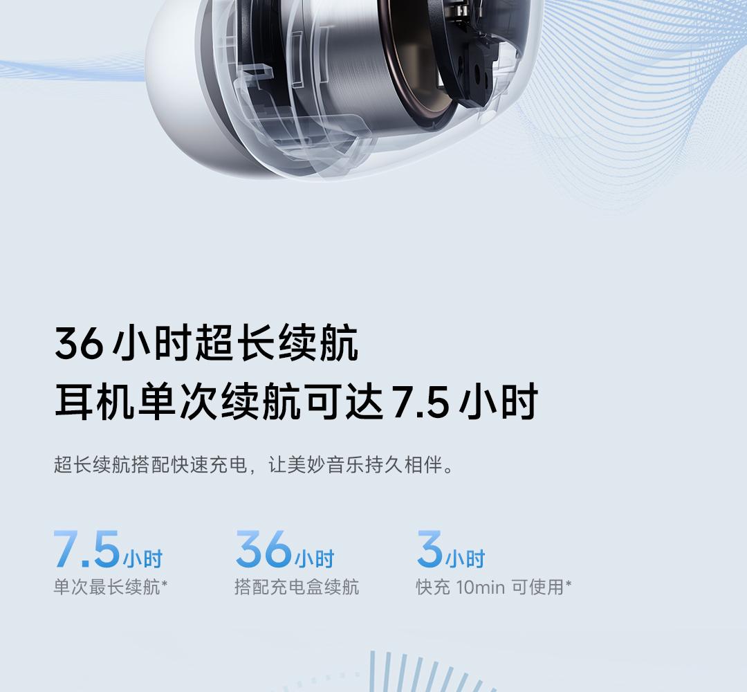 该款耳机支持 AI 通话降噪,宣称 4m/s 通话抗风噪。耳机单次续航时长约 7.5 小时,搭配充电盒使用约 36 小时,宣称快充 10min 可使用 3 小时。
