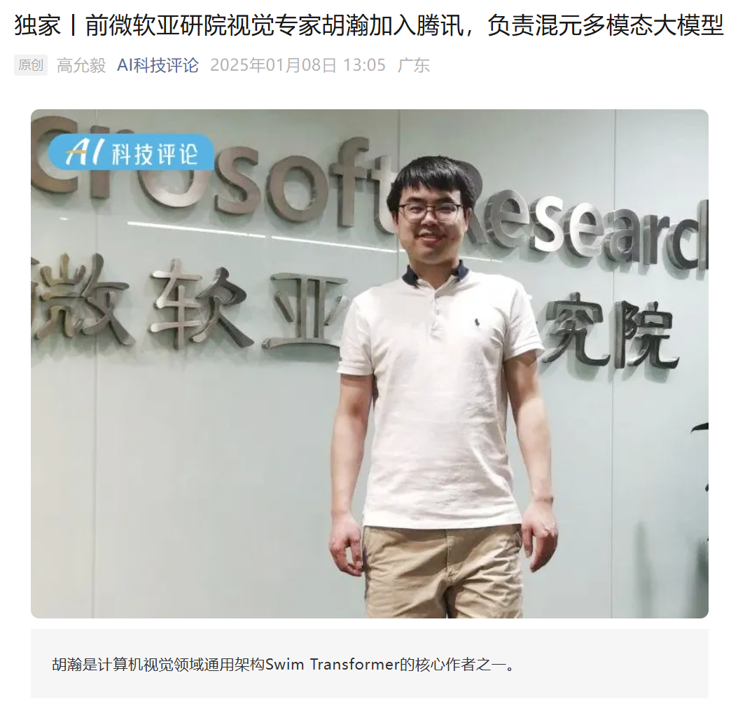 IT之家 1 月 8 日消息,据 AI 科技评论消息,前微软亚洲研究院视觉计算组首席研究员胡瀚,不久前加入腾讯,接替已离职的前腾讯混元大模型技术负责人之一的刘威,负责多模态大模型的研发工作。