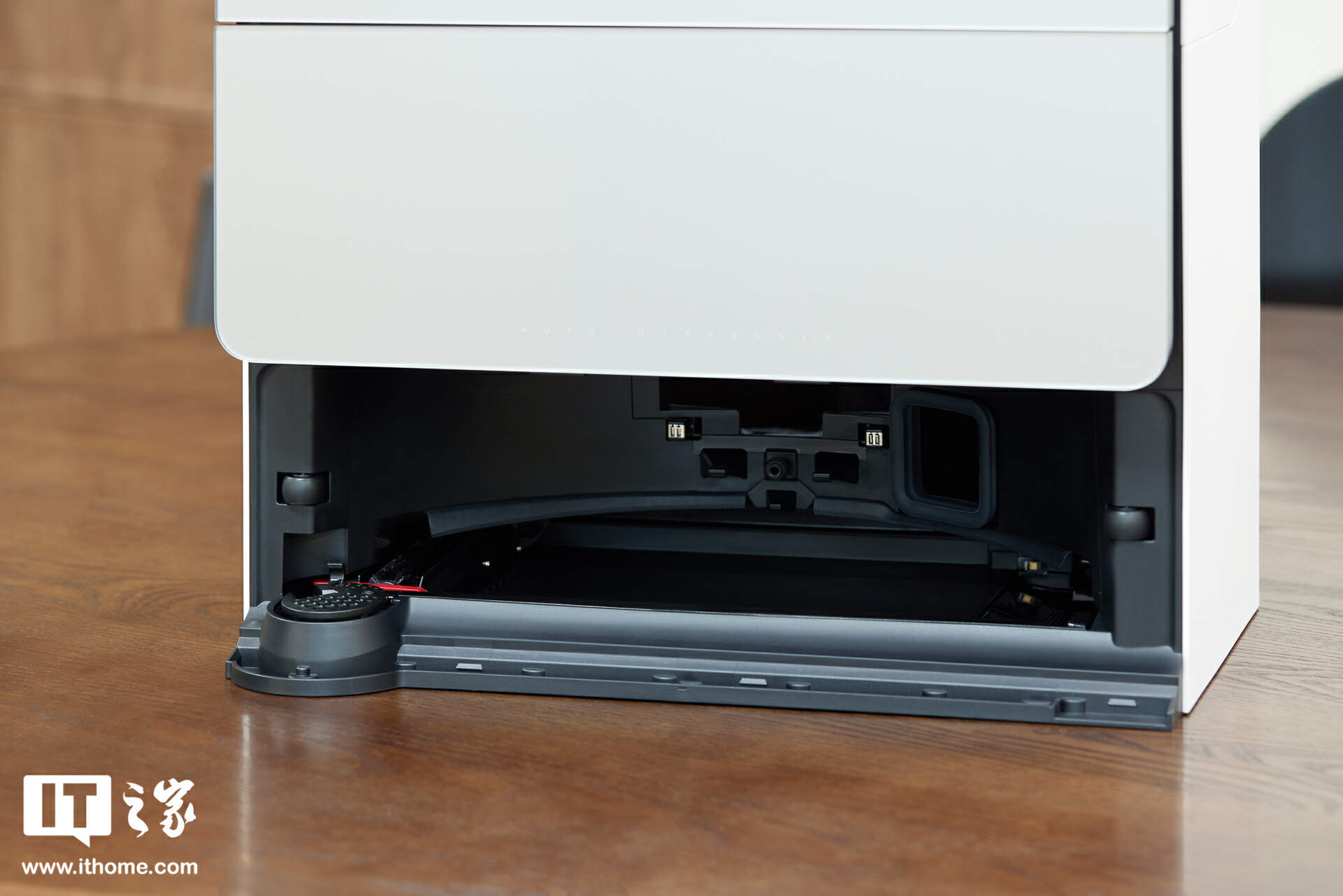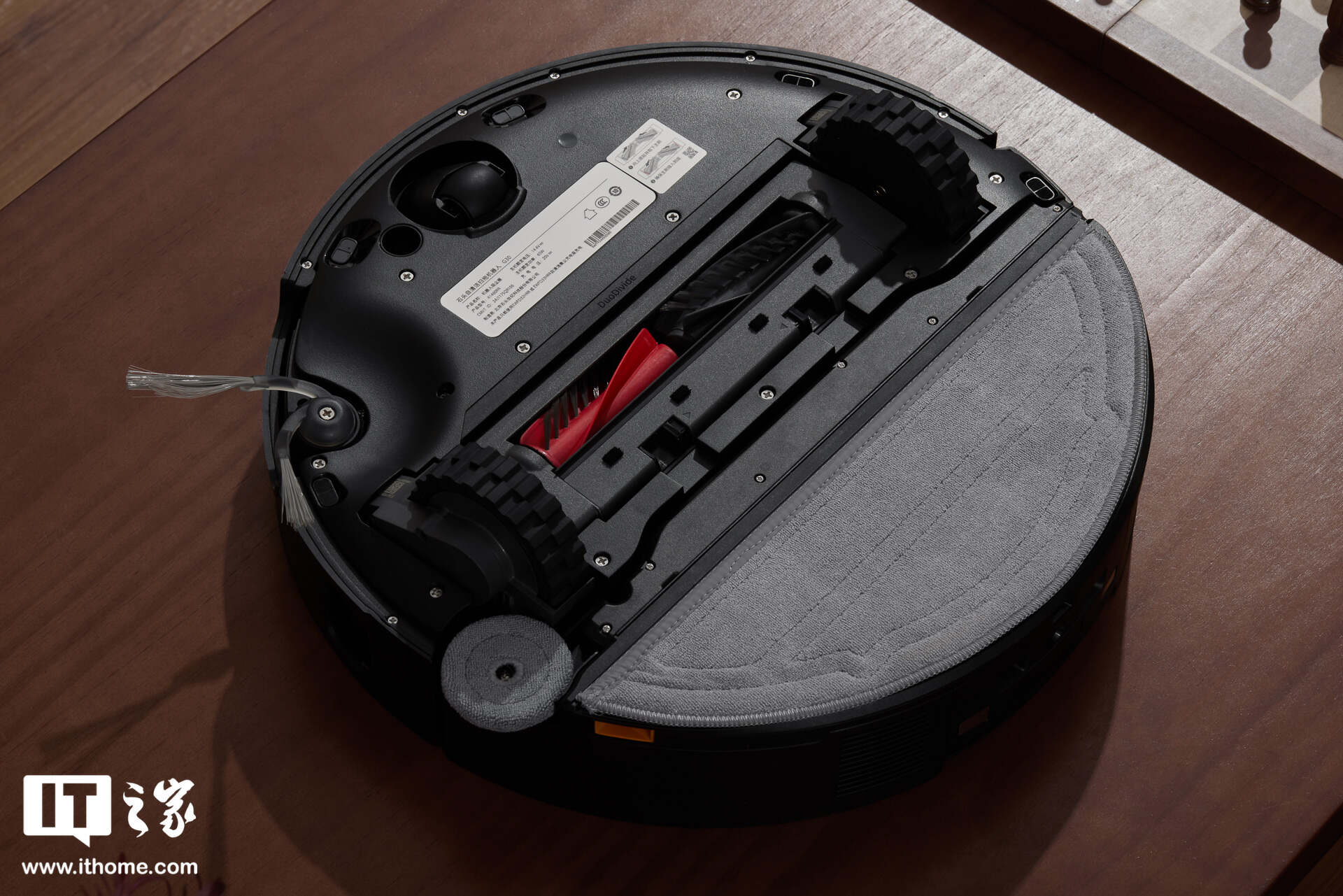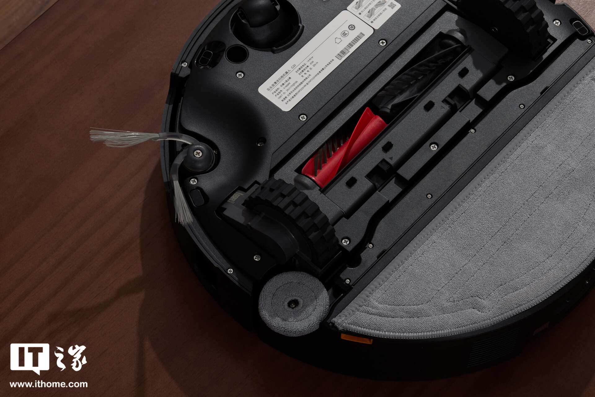 来到底部,可以看到两段式胶毛一体主刷,更长的螺旋圆弧边刷同样采用了机械臂结构,识别到墙角,会主动伸出清扫。