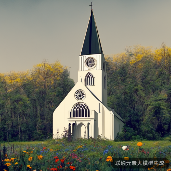 提示词:在绿色的森林中,隐藏着一座白色的哥特式教堂,教堂的尖塔直指蓝色的天空,教堂周围是五彩斑斓的野花和浅黄色的草坪(中文长文本)