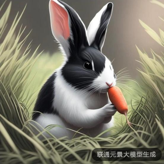 提示词:一只身体毛发黑白相间的兔子正在草丛间啃胡萝卜