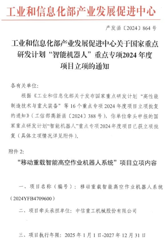 IT之家 1 月 8 日消息,根据工信部通知,由中信重工牵头申报的国家重点研发计划“智能机器人”重点专项“移动重载智能高空作业机器人系统”项目获批立项,执行年限为 2025 年~2027 年底。