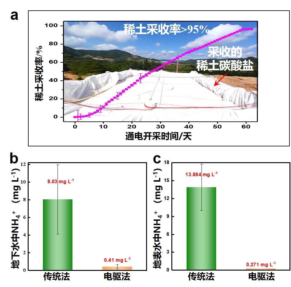通过 60 天的通电开采,工业试验的稀土采收率达到了 95% 以上(图 2a)。环境监测结果表明,地下水和地表水中的氨氮排放量相比传统开采工艺减少了 95%(图 2b,2c),极大降低了稀土开采的环境影响。