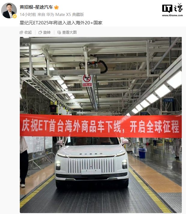 IT之家 1 月 9 日消息,昨晚,奇瑞星途营销中心总经理黄招根宣布,星纪元 ET 首台海外商品车迎来正式下线,2025 年将进入海外 20 + 国家。