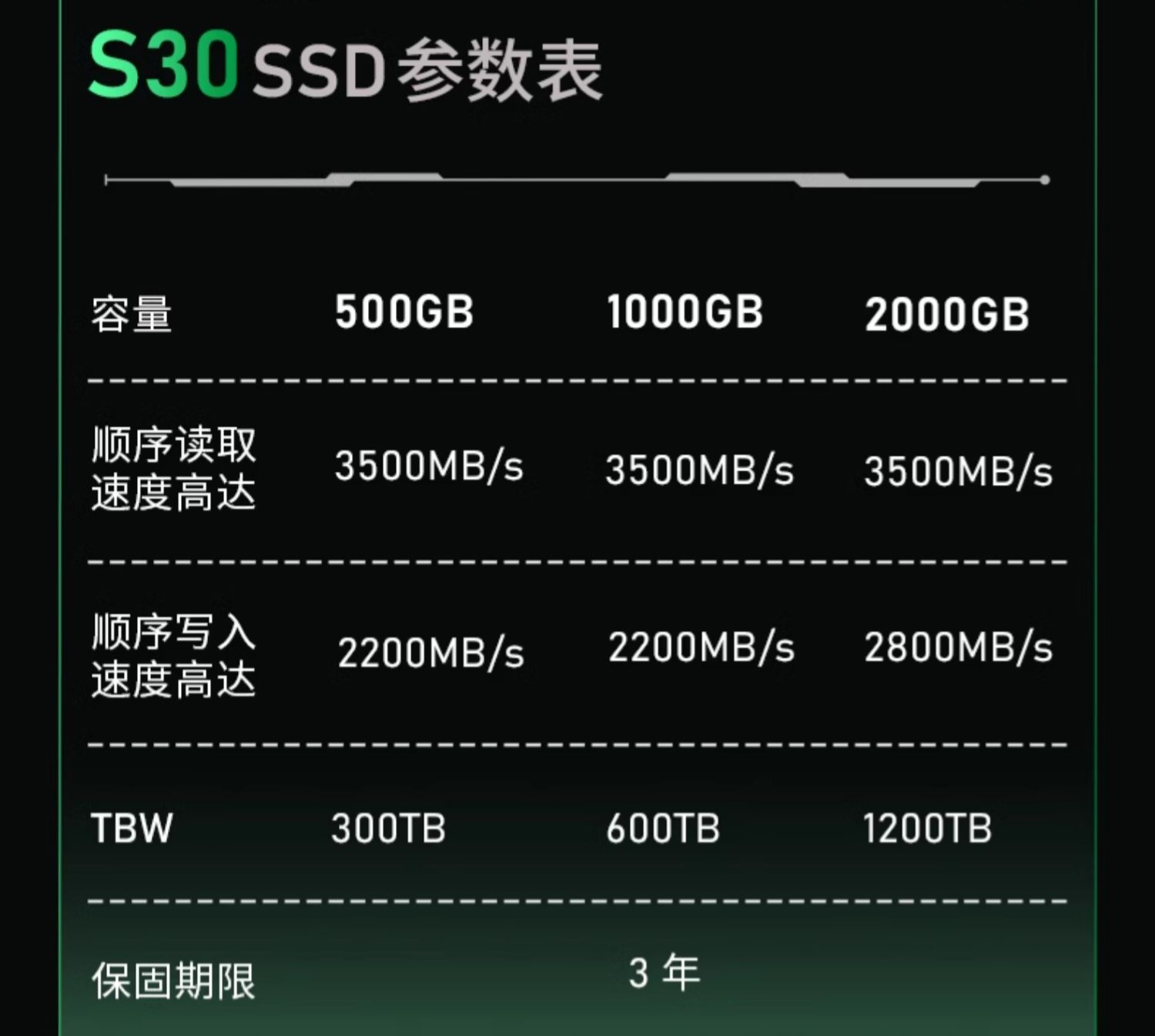 翼龙 S30 为入门级 PCIe 4.0 SSD,采用单面 3D NAND 颗粒 + 最大 400GB 动态 SLC 缓存,读取速度为 3500MB/s,写入速度则根据容量的不同,500GB / 1TB 规格为 2200MB/s,2TB 规格则为 2800MB/s。