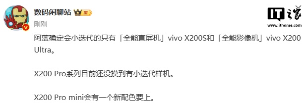 IT之家 1 月 9 日消息,博主 @数码闲聊站 今日爆料称,vivo 确定会小迭代的只有「全能直屏机」vivo X200S 和「全能影像机」vivo X200 Ultra。X200 Pro 系列目前还没摸到有小迭代样机,X200 Pro mini 会有一个新配色要上。