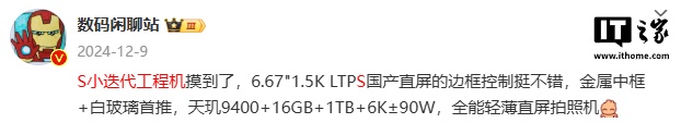 就在上个月,该博主爆料称“S 小迭代工程机”搭载 6.67" 1.5K LTPS 国产直屏,“边框控制挺不错”。配置方面,该机搭载天玑 9400 处理器、16GB+1TB、6K±mAh 电池,支持 90W 充电。当时评论区网友推测该机为 vivo X200S。