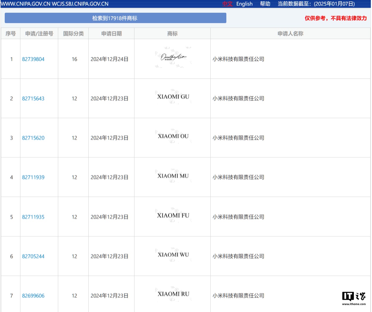 IT之家 1 月 9 日消息,IT之家从国家知识产权局中国商标网获悉,小米科技有限责任公司已于上月末申请注册“XIAOMI FU”“XIAOMI WU”“XIAOMI OU”“XIAOMI MU”“XIAOMI GU”“XIAOMI RU”等一系列商标,国际分类均为运输工具,当前商标状态均为等待实质审查。