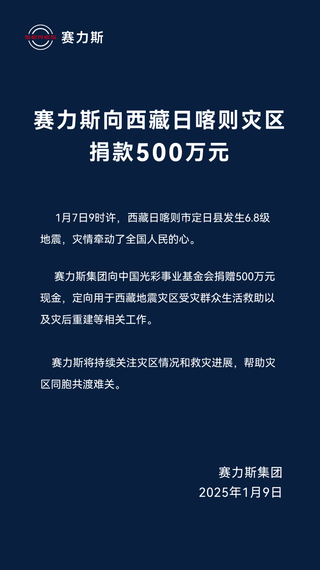 IT之家 1 月 9 日消息,IT之家从赛力斯集团官方微信公众号获悉,赛力斯集团向中国光彩事业基金会捐赠 500 万元现金,定向用于西藏地震灾区受灾群众生活救助以及灾后重建等相关工作。