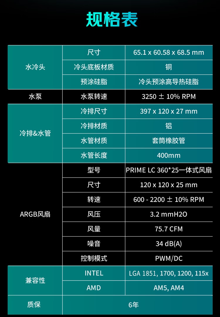 散热器本身采用纯铜高密度水槽导热底座,配有 360mm 冷排及三联一体式 120mm 风扇,转速 2200±300rpm,风量 75.7 CFM,静风压 3.2 mmH2O,噪音 37.6 dBA,支持 Aura RGB 灯效。