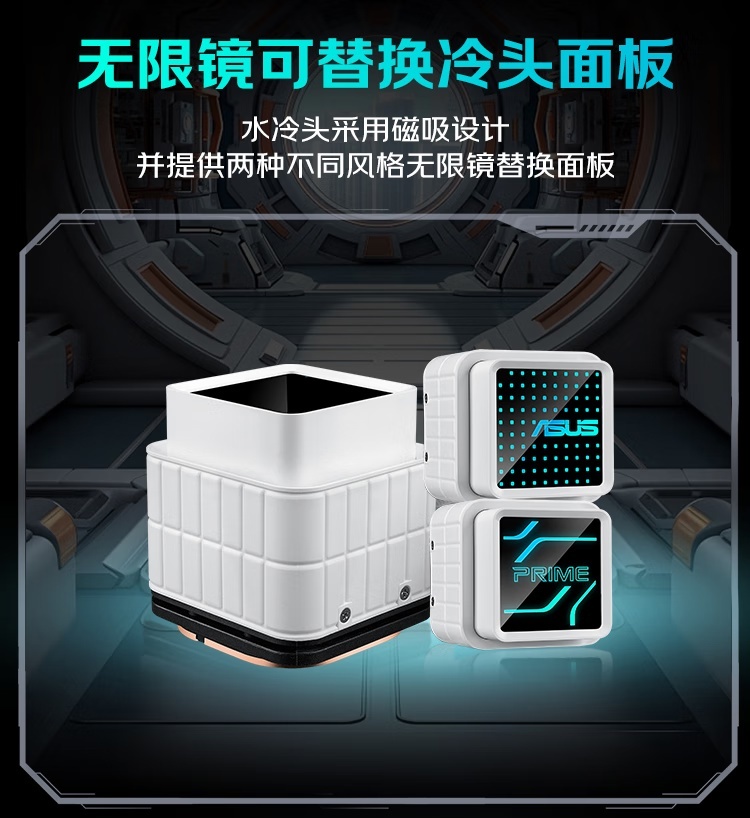 这款散热器采用了纯白主色调,除了螺丝、屏幕之外能看的地方都是白色。它还采用了可个性化定制的无限镜水冷头,采用了独特的圆角矩形设计,并创新性地配备了磁吸式无限镜替换面板。