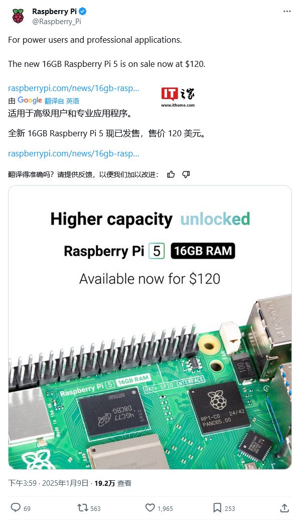 IT之家 1 月 10 日消息,树莓派基金会昨日(1 月 9 日)发布公告,宣布推出 16GB 版本树莓派 5 开发板,售价 120 美元(IT之家备注:当前约 881 元人民币),并同步推出“树莓派碳移除信用额度”,用于抵消生产和处置树莓派过程中产生的碳排放。