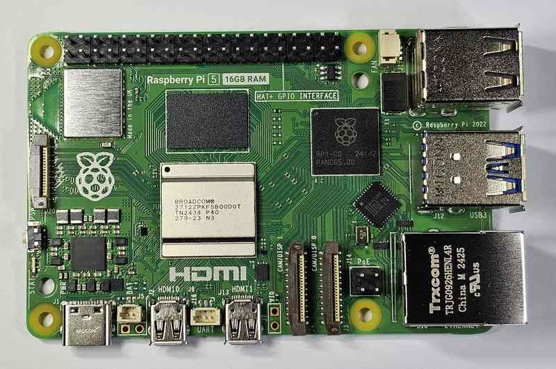 树莓派 5 开发板搭载博通 BCM2712 芯片,其优化的 D0 步进版本支持大于 8GB 的内存,官方联合美光公司,封装了 8 个 16Gbit LPDDR4X 芯片,从而首次提供 16GB 内存版本。