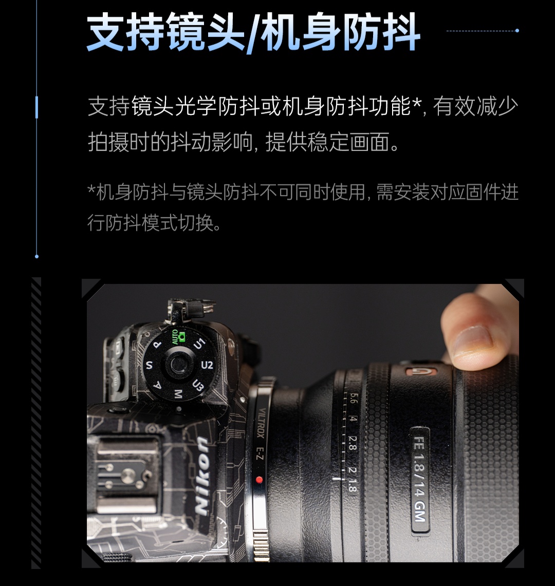 这款转接环采用黄铜材质,配备防滑齿轮环,自带电子触点,支持 EXIF 信息传输,支持自动对焦,支持镜头防抖,支持机身光圈调节与镜身光圈环调节。