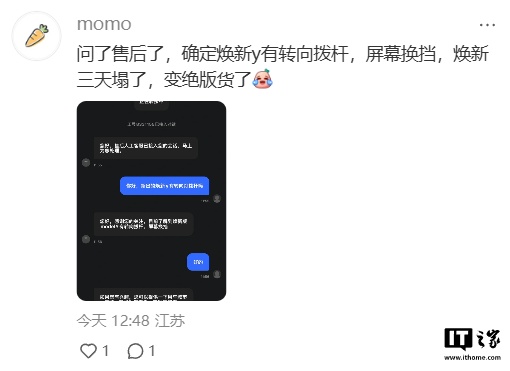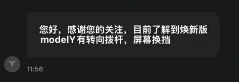 此外,网友晒出的特斯拉售后人工客服回答显示,焕新 Model Y 有转向拨杆,但采用屏幕换挡。