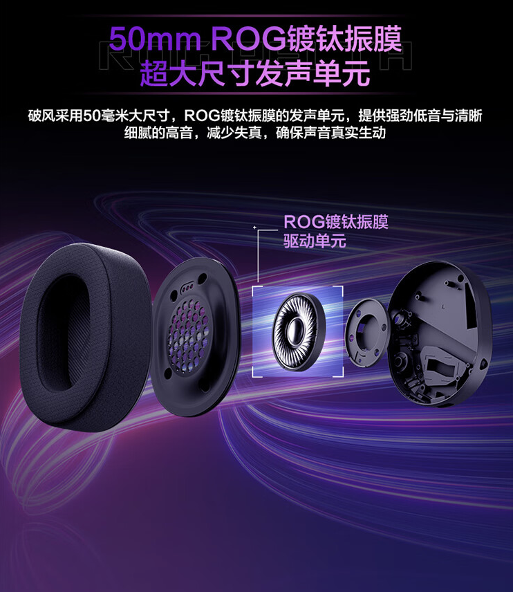 IT之家获悉,这款耳机配备 50mm ROG 镀钛振膜,号称音质经过特殊调教,宽频响应范围 20Hz-20KHz,配有 10mm 超宽频吊杆麦克风,同时支持 SpeedNova 无线技术,号称在 2.4GHz 下至高可以使用 70 小时、在蓝牙下至高可以使用 90 小时。
