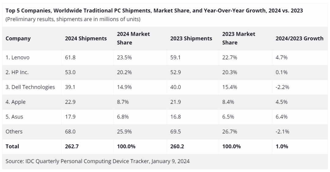 IT之家附各品牌排名如下,2024 全年来看,联想、惠普、戴尔、苹果、华硕排名全球 PC 市场前五,其中只有戴尔的出货量同比下滑了 2.2%,其余四个品牌均有增长。
