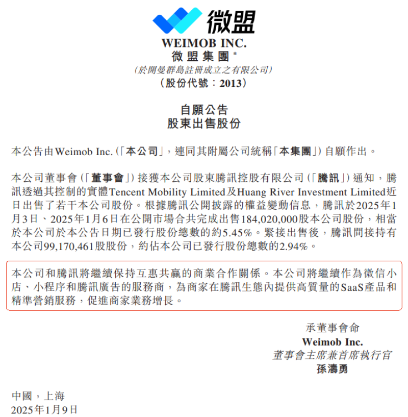 微盟集团官方也发布公告称,腾讯于 1 月 3 日、1 月 6 日出售 1.84 亿股微盟集团股份,相当于已发行股份总数的约 5.45%。此次减持后,腾讯间接持有微盟集团 9917.05 万股股份,约占已发行股份总数的 2.94%。公司和腾讯将继续保持互惠共赢的商业合作关系,公司将继续作为微信小店、小程序和腾讯广告的服务商,为商家们在腾讯生态内提供高质量的 SaaS 产品和精准营销服务,促进商家业务增长。