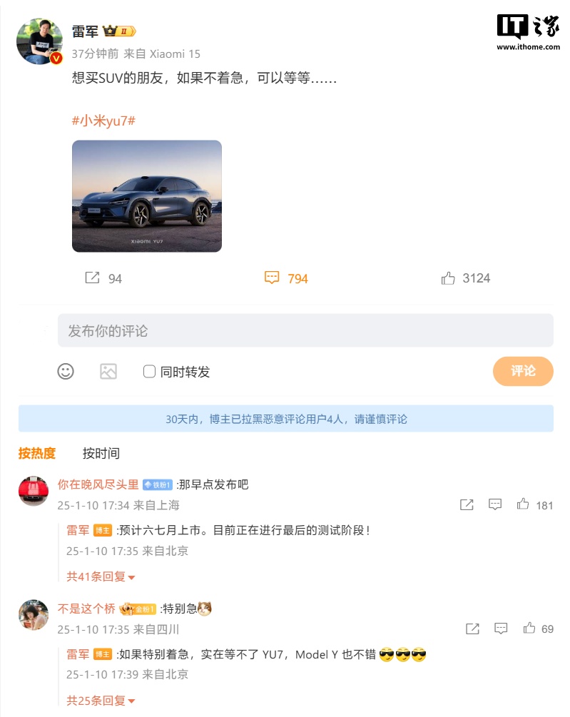 雷军随后在评论区重申小米 YU7 预计 6-7 月上市,并透露新车正在进行最后的测试。而有网友表示“特别急”,雷军回复:“如果特别着急,实在等不了 YU7,Model Y 也不错。”