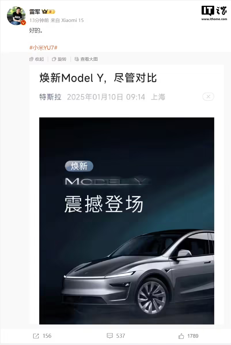今天早些时候,据IT之家报道,特斯拉焕新 Model Y 正式发布后,官方公众号宣传语为“焕新 Model Y,尽管对比”。对此,雷军发布微博称“好的”。
