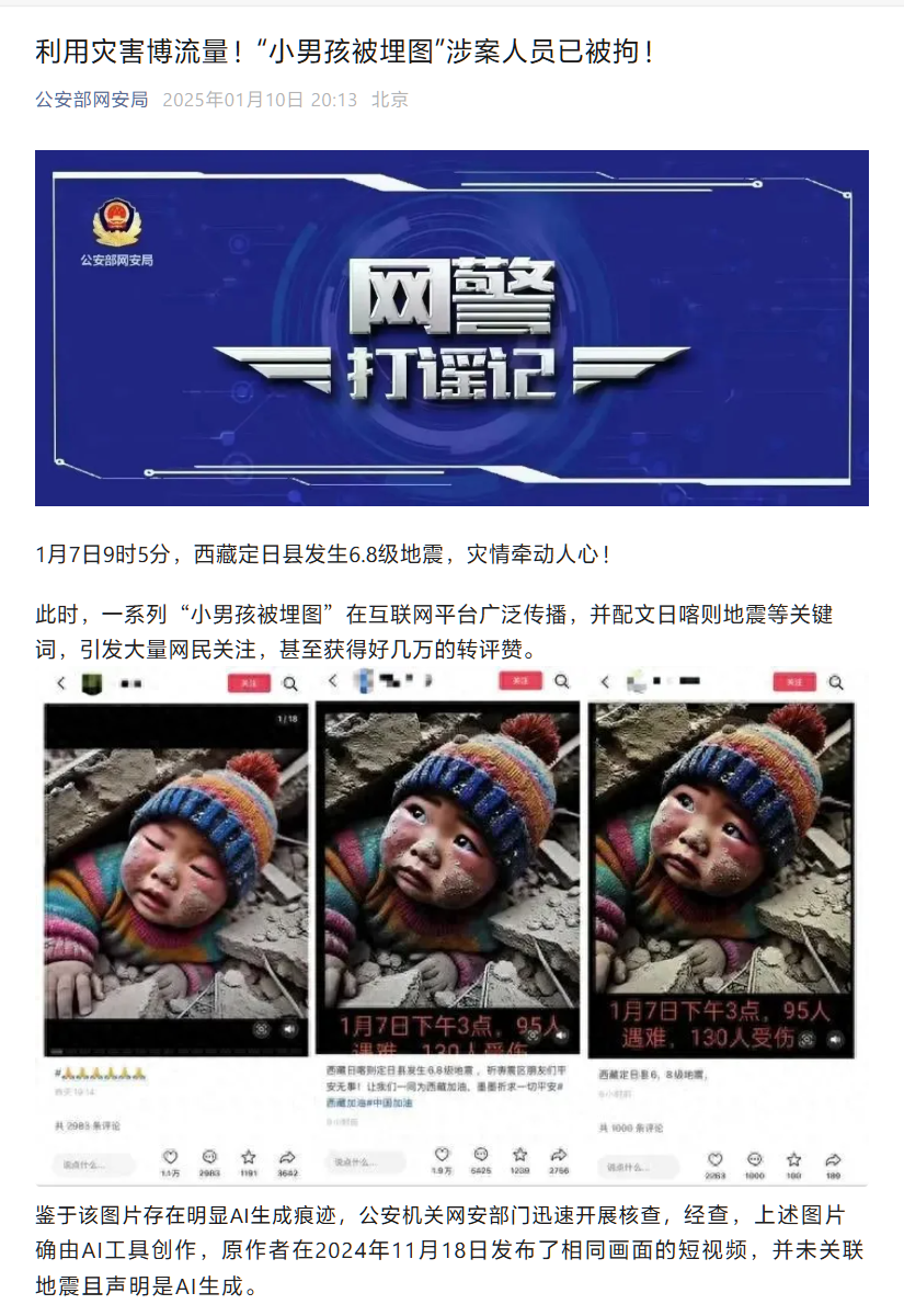 事件背景:1 月 7 日 9 时 5 分,西藏定日县发生 6.8 级地震,灾情牵动人心。但此时一系列“小男孩被埋图”在互联网平台广泛传播,并配文日喀则地震等关键词,引发大量网民关注,甚至获得好几万的转评赞。
