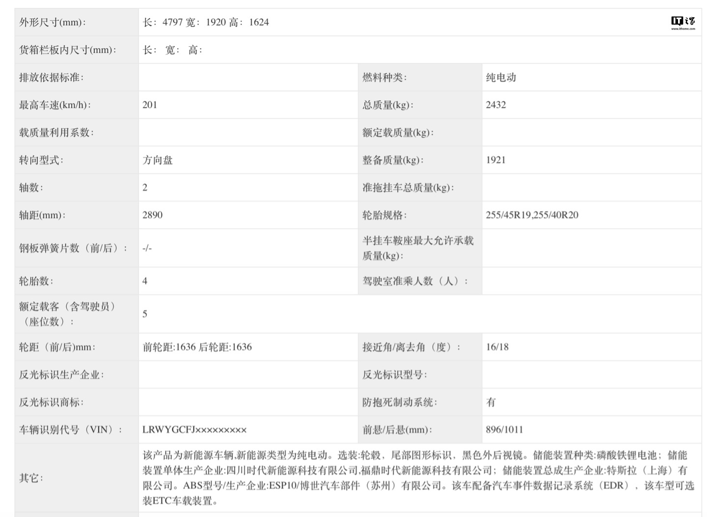 参考申报介绍,IT之家获悉该车新车长宽高分别为 4797x1920x1624 毫米,轴距 2890 毫米,提供 19 英寸和 20 英寸两种规格的轮毂可选。