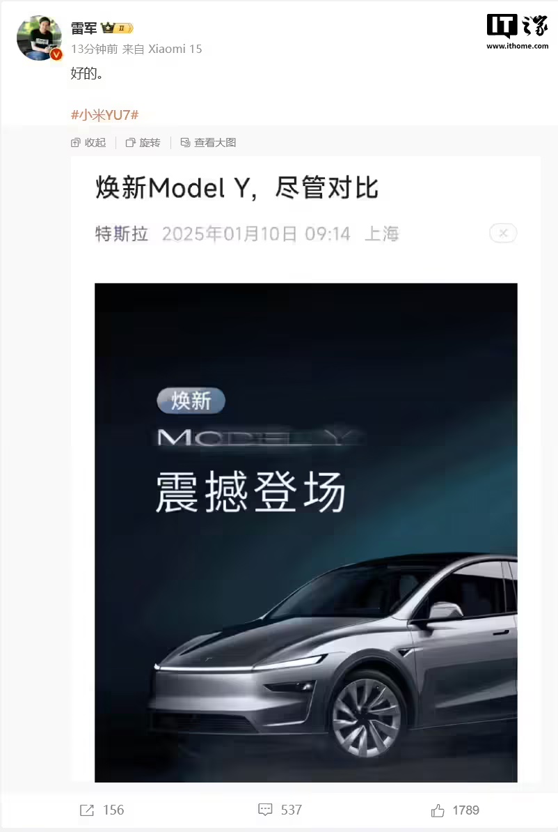 特斯拉焕新 Model Y 正式发布后,官方公众号宣传语为“焕新 Model Y,尽管对比”。对此,雷军发布微博称“好的”。