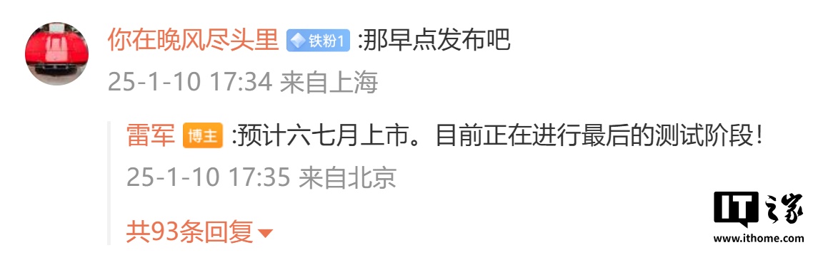 小米创办人、董事长兼 CEO 雷军今日在微博表示,小米 YU7 预计六七月上市,并透露新车目前正在进行最后的测试阶段。