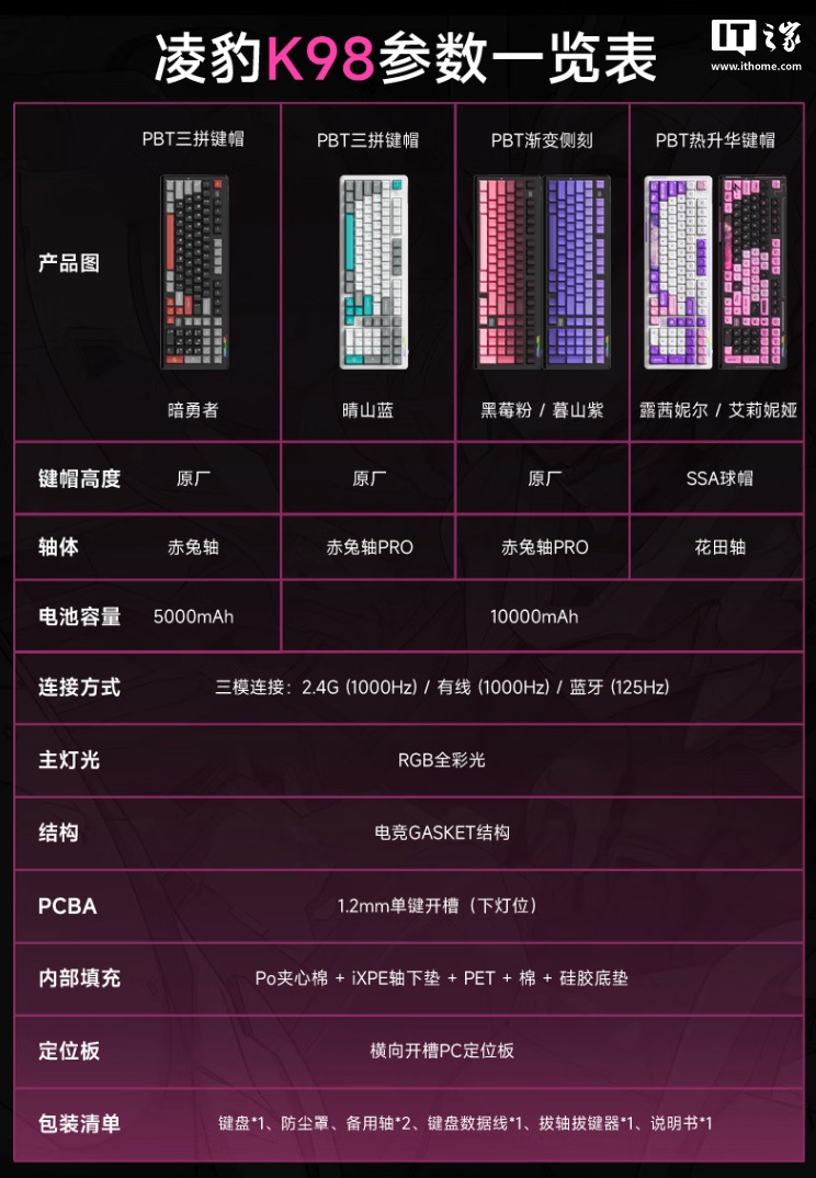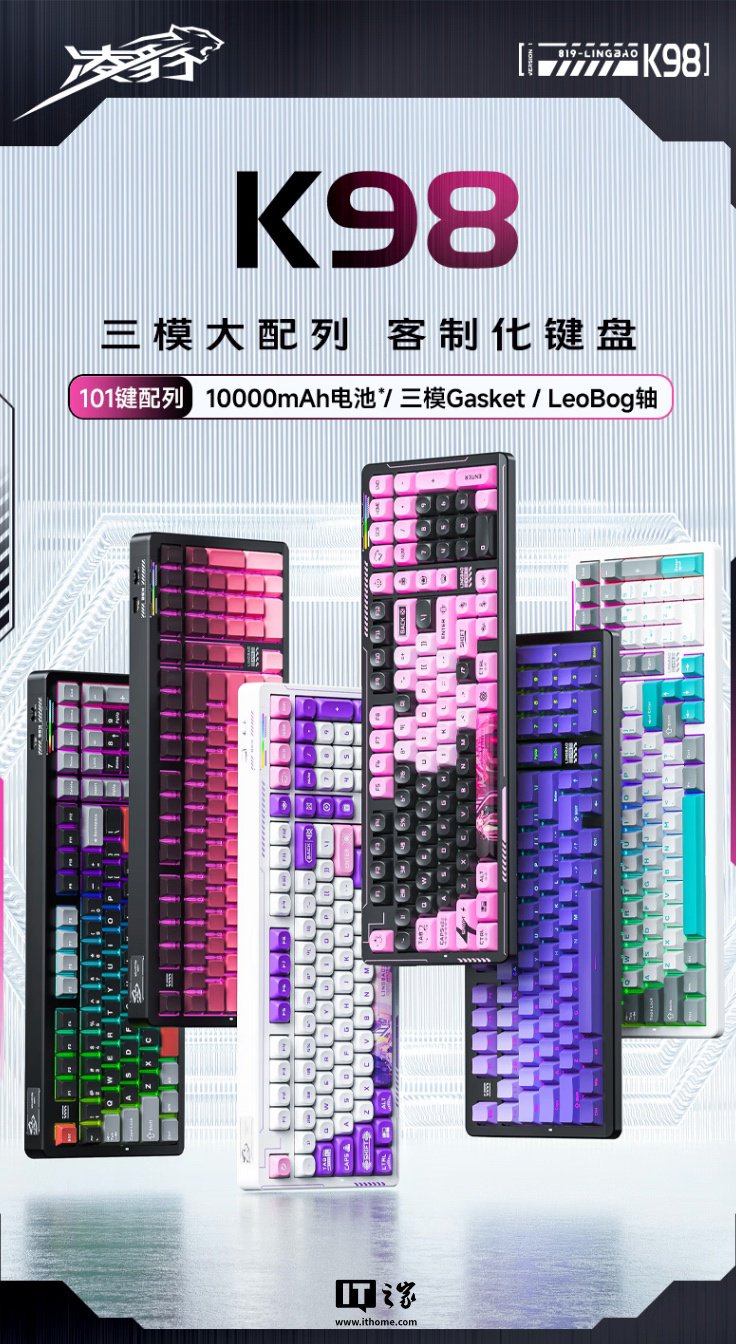IT之家 1 月 10 日消息,凌豹现已在京东上架一款型号为 K98 的三模机械键盘,这款键盘采用 Gasket 结构,可选多种轴体,IT之家整理价格如下: