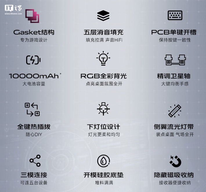 系列键盘使用 101 键三模配列,采用 Gasket 结构,使用下灯位设计,键盘配备侧翼流光灯带,同时配有按压式 2.4GHz 接收器收纳仓,可选 5000/10000 毫安时电池版本。