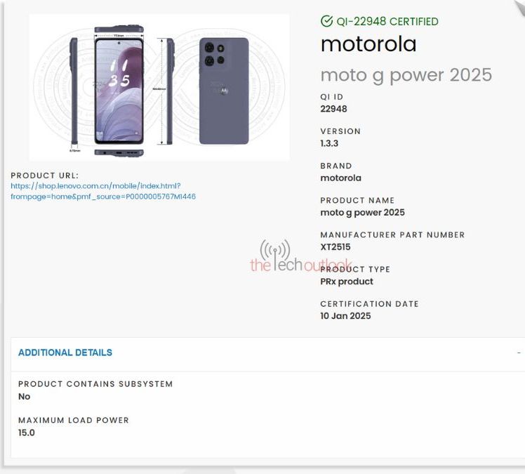 IT之家 1 月 11 日消息,科技媒体 The Tech Outlook 今天(1 月 11 日)发布博文,报道称 2025 款摩托罗拉 Moto G Power 手机通过 Wireless Power Consortium(WPC)认证,并揭示了该机的无线充电规格和外观渲染图。