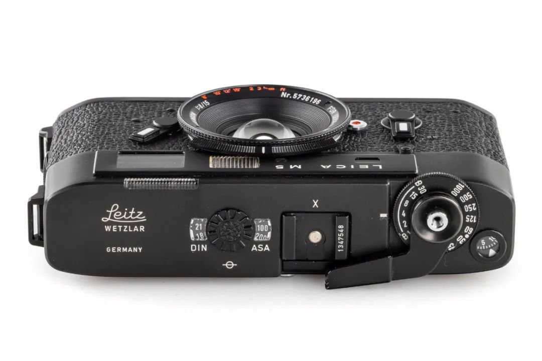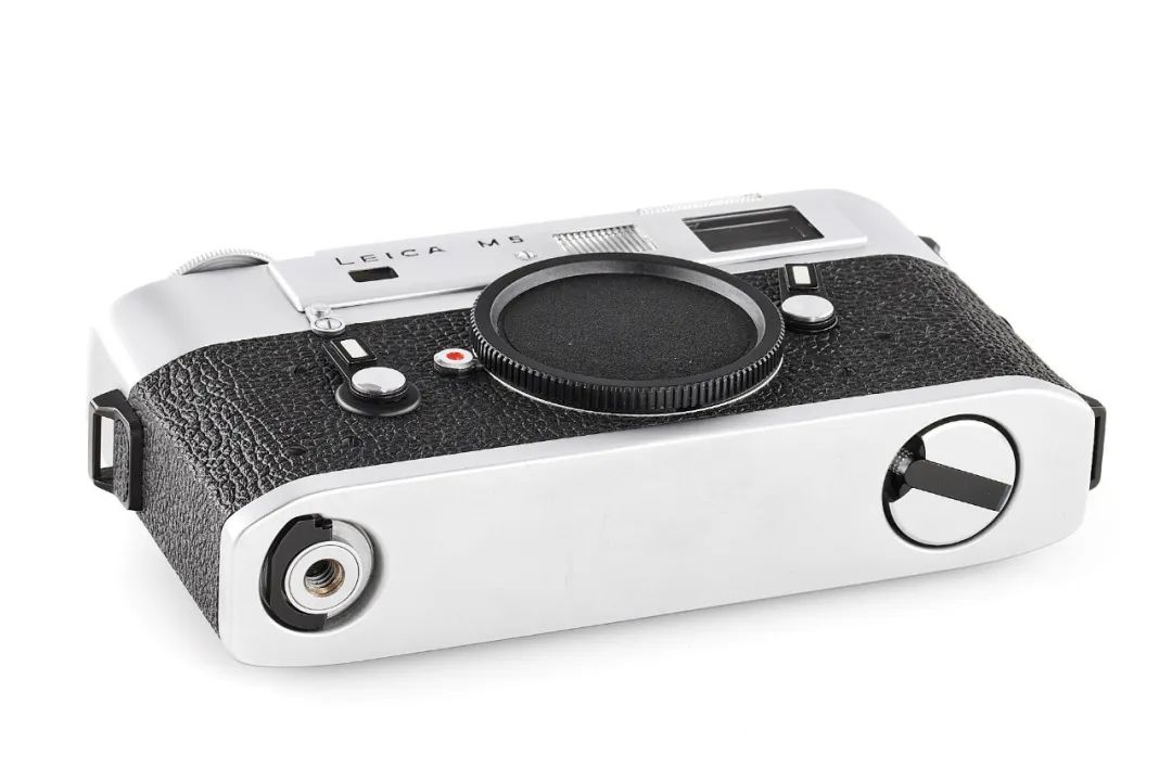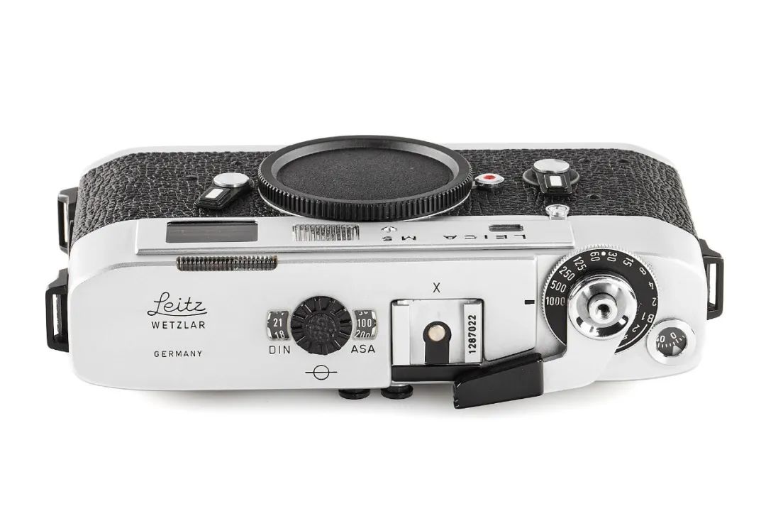 加入这个 TTL 系统后,机身变得肥大,M5 要比 M4 大了一圈,这里面包括电池的体积。机身为测光指示提供光源,在机顶加一个引光窗,所以 M5 突破性地把倒片放到了机身底部,这在徕卡 M 相机序列里也是独一无二的。