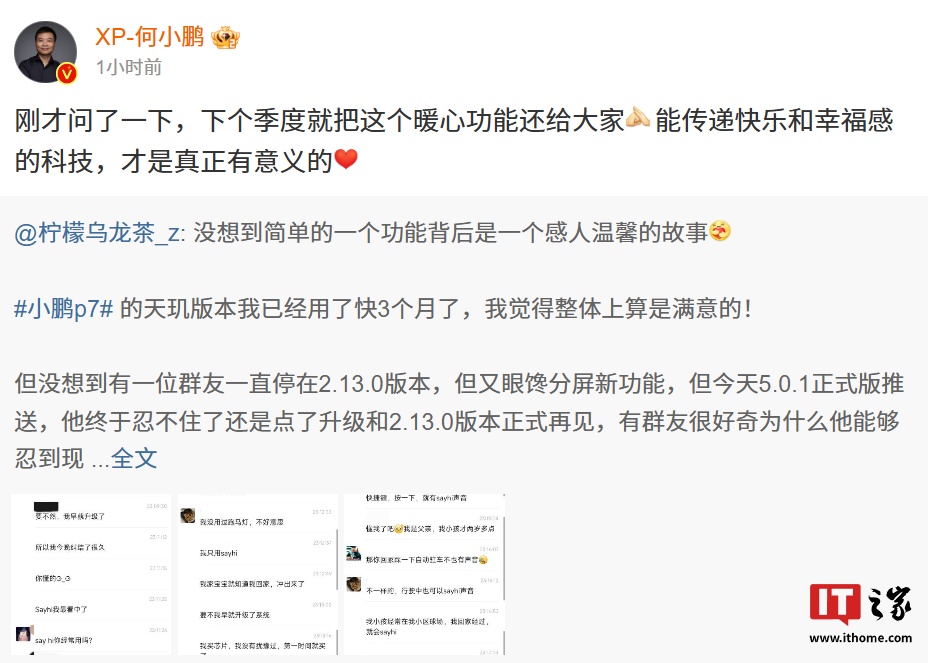 IT之家 1 月 12 日消息,小鹏汽车董事长何小鹏今日转发了网友因需要 X 键触发“Say Hi”功能而放弃升级最新车机系统的故事,并回复称“下个季度就把这个暖心功能还给大家”。