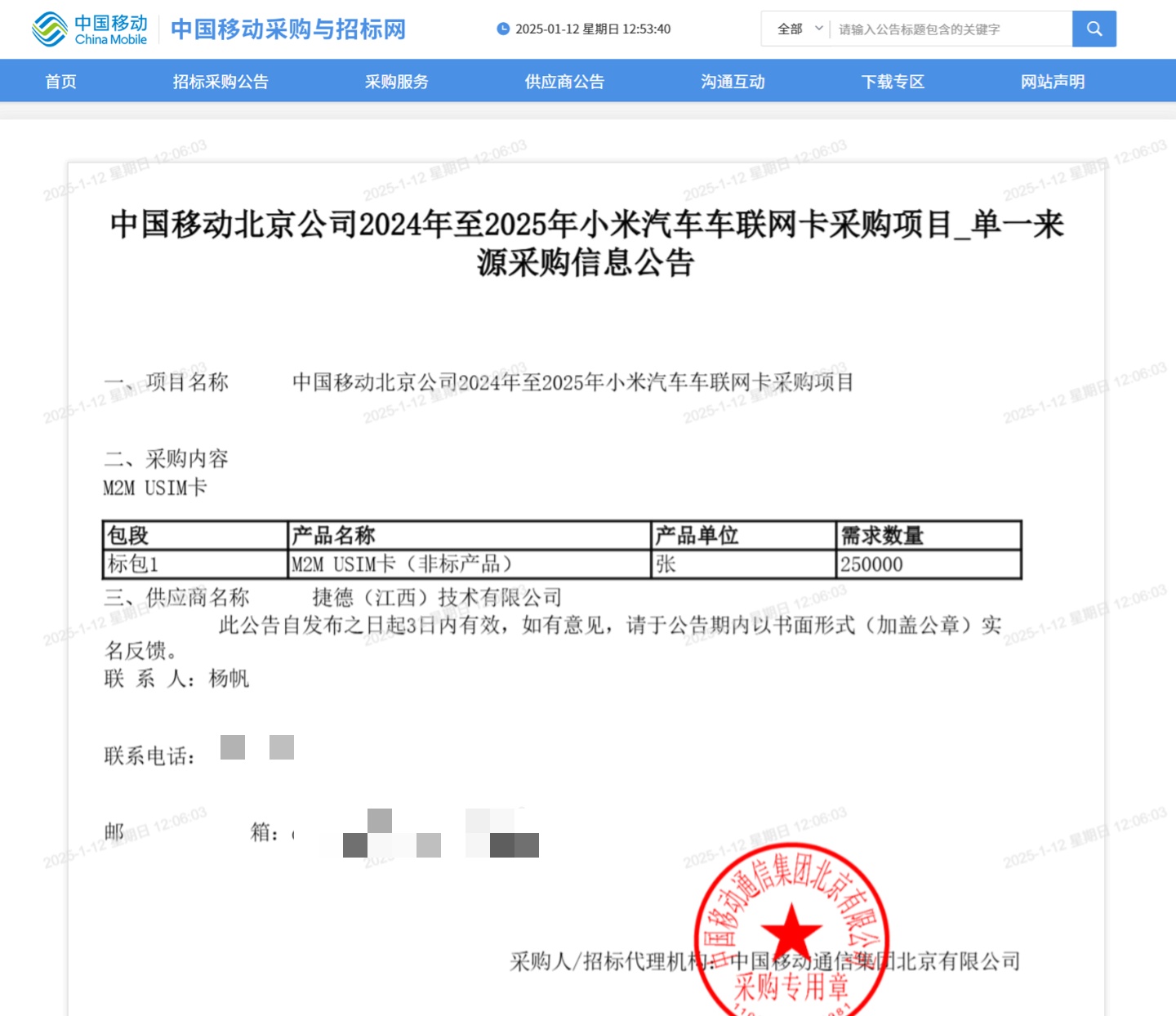 IT之家 1 月 12 日消息,中国移动采购与招标网显示,小米汽车向中国移动采购了 25 万张 M2M USIM 卡(非标产品),供应商为捷德(江西)技术有限公司。