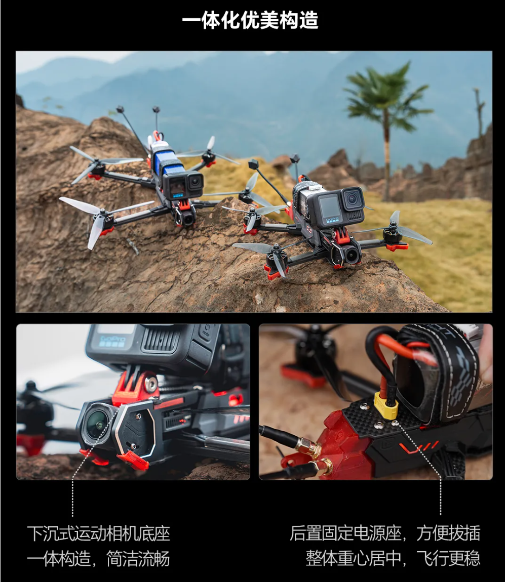 一体化构造:后置固定电源座,方便拔插,整体重心居中,飞行更稳;下沉式运动相机底座,外观简洁流畅