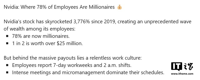 IT之家 1 月 12 日消息,近年来,英伟达(Nvidia)凭借其在人工智能和图形处理领域的领先地位,迅速崛起为全球市值第二的公司,甚至一度超越苹果坐上第一宝座。最新数据显示,英伟达 78% 的员工已成为百万(美元)富翁,但这一财富奇迹的背后却是高强度的工作文化和“黄金手铐”的束缚。