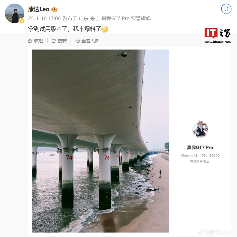 IT之家 1 月 13 日消息,realme UI 产品经理 @康达Leo 上周发文称拿到了“试用版本”,并分享了真我 GT7 Pro 手机拍摄的照片样张(此处预计指 GT7 Pro 手机的 realme UI 最新试用版本)。