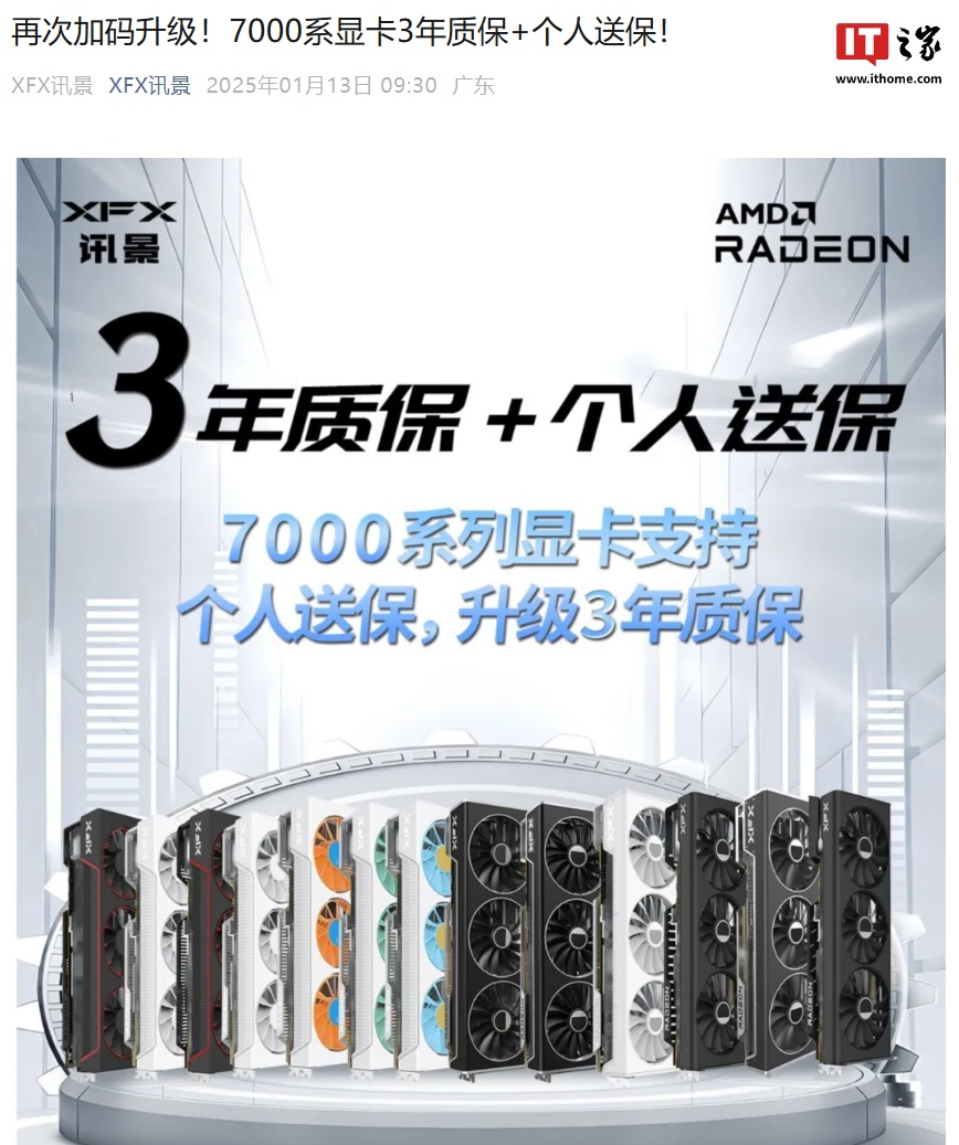 IT之家 1 月 13 日消息,XFX 讯景今日发文宣布权益“再次加码升级”,旗下 7000 系显卡将支持 3 年质保 + 个人送保。