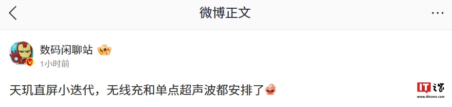 IT之家 1 月 13 日消息,博主 @数码闲聊站 今日发文称,某厂天玑直屏小迭代手机“无线充和单点超声波都安排了”,暗示新机配备单点超声波指纹,同时支持无线充电。从评论区讨论来看,该机预计为 vivo X200S。