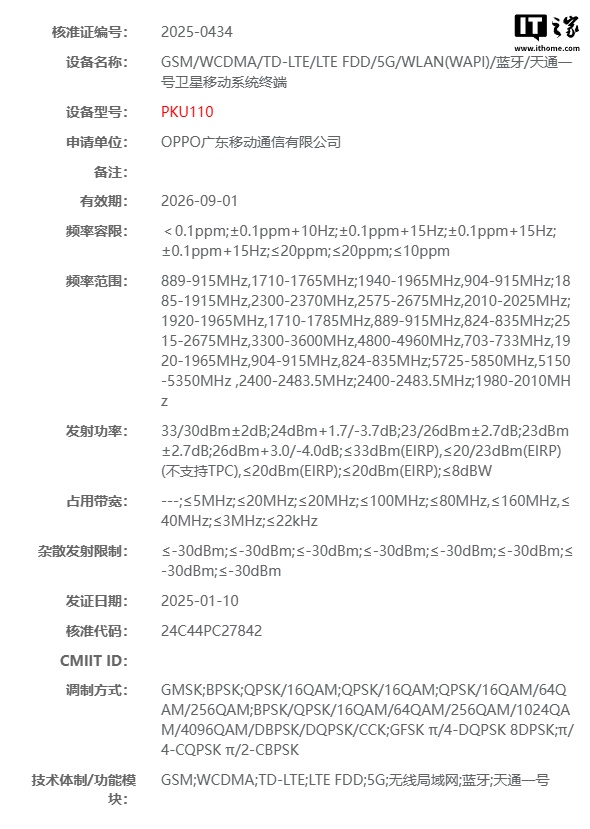 IT之家 1 月 13 日消息,一款型号为 PKU110 的 OPPO 手机于 1 月 10 日通过了工信部无线电核准,设备名称包含“天通一号卫星移动系统终端”。