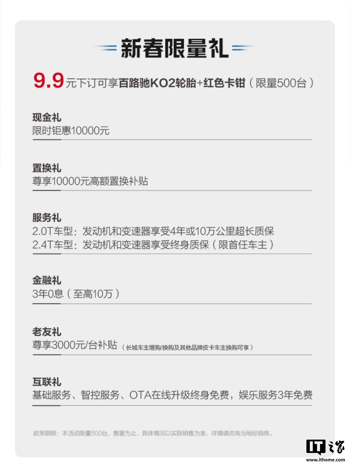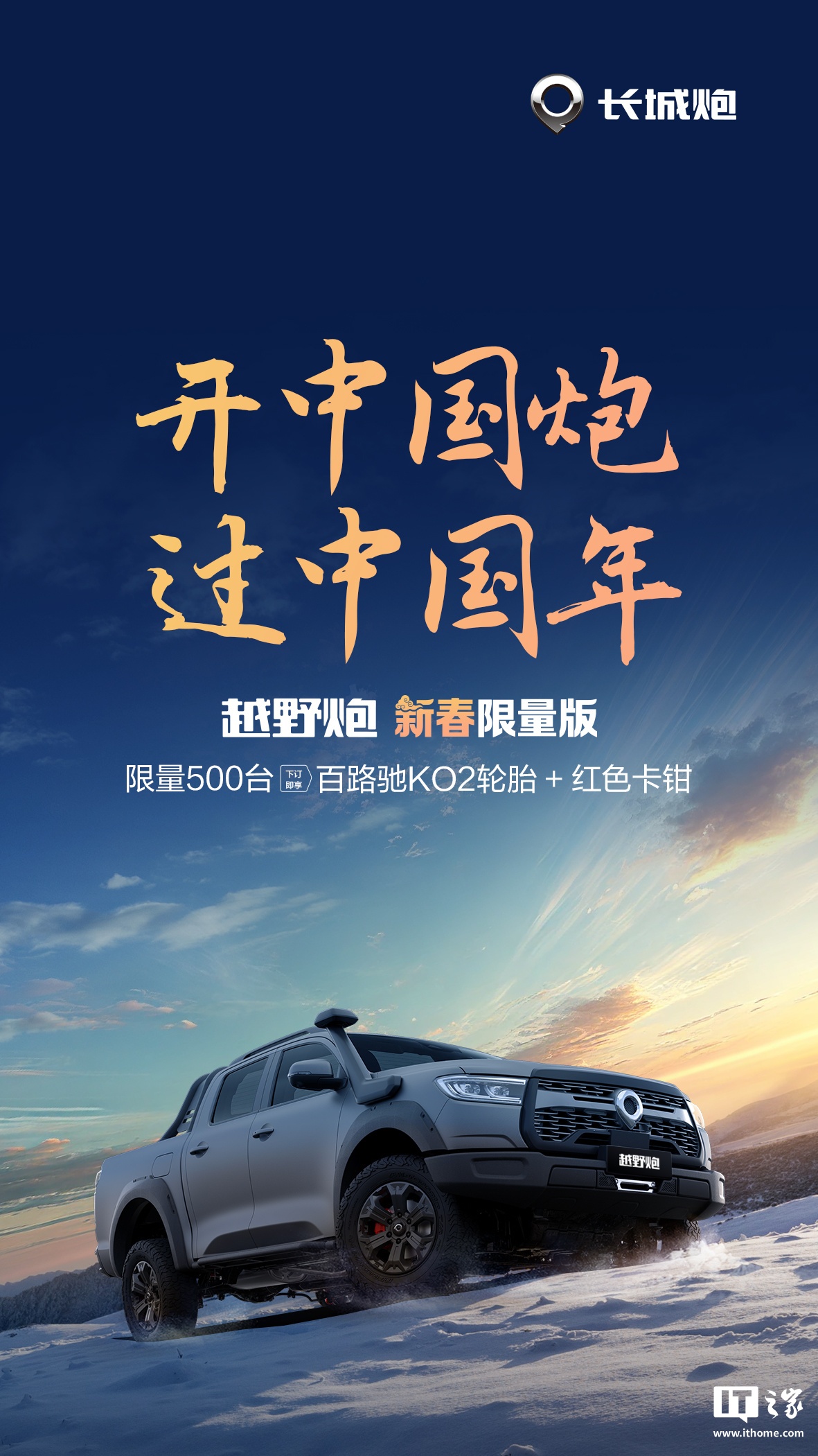 IT之家 1 月 13 日消息,长城炮官方今日宣布推出越野炮新春限量版,9.9 元下订可享百路驰 KO2 轮胎 + 红色卡钳,限量 500 辆。