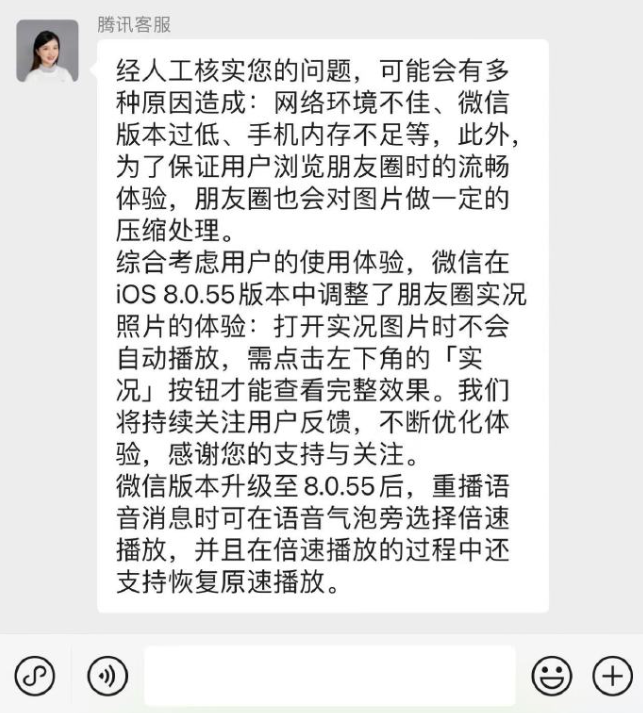 该功能此前已进行过灰度测试,对此,腾讯客服表示,微信版本升级至 8.0.55 后,重播语音消息时可在语音气泡旁选择倍速播放,并且在倍速播放的过程中还支持恢复原速播放。