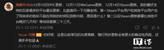 IT之家 1 月 13 日消息,2024 年 12 月《黑神话:悟空》迎来了一次重大更新,此次更新于 12 月 11 日率先登陆 Epic 平台,次日登陆 WeGame 平台,直到 12 月 14 日才在 Steam 平台上线。这一更新安排引发了部分玩家的不满和疑惑,尤其是 Steam 平台的玩家,他们质疑为何玩家数量最多的平台最后才获得更新。