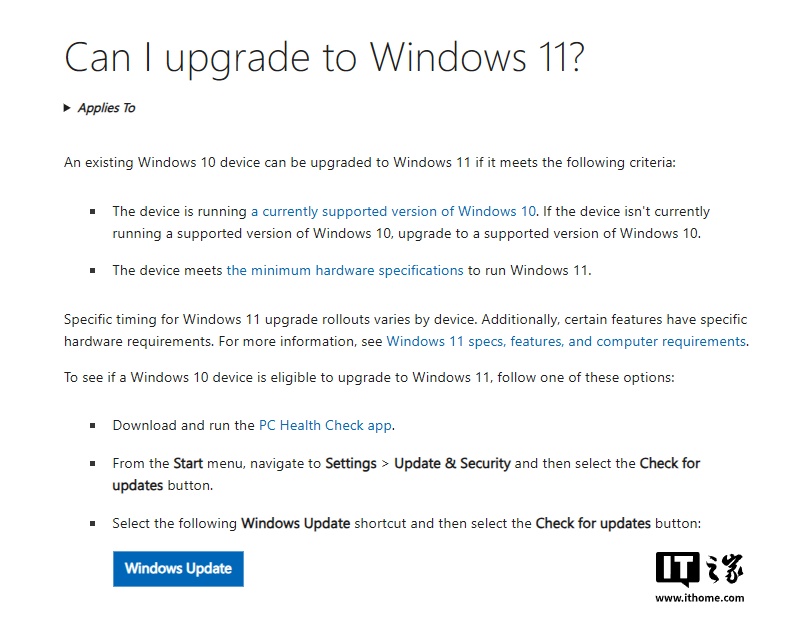 据 Neowin 报道,微软近日还更新了其官网上的一篇支持文章,标题为《我可以升级到 Windows 11 吗?》。此次更新并未增加新信息,但对页面布局进行了优化,使其更易于阅读。此外,微软还在页面中添加了一个快捷链接,用户可直接跳转至 Windows 更新设置页面。