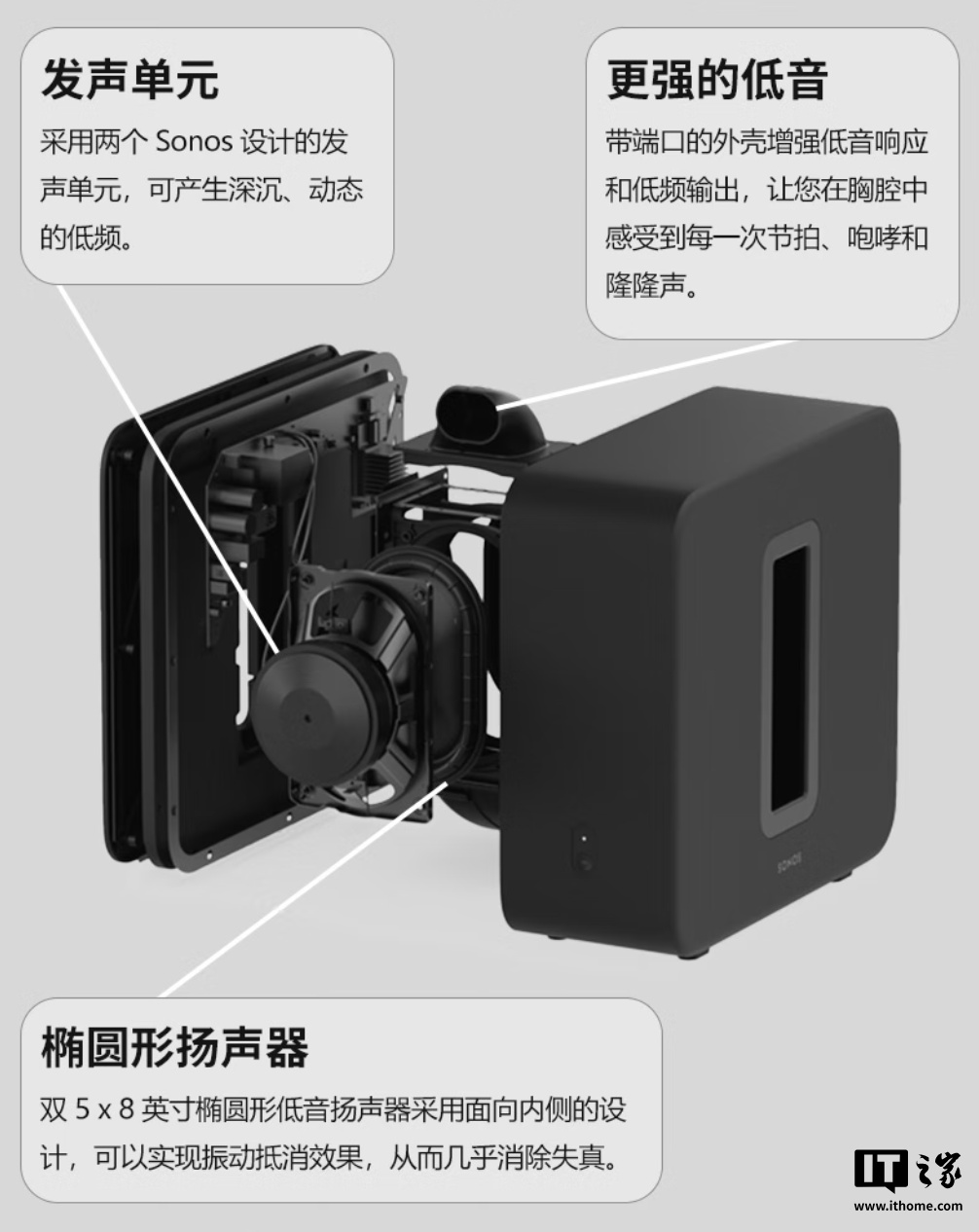 官方宣称,Sonos Sub 4 采用两个 Sonos 设计的发声单元,可产生深沉、动态的低频;带端口的外壳增强低音响应和低频输出;双 5×8 英寸椭圆形低音扬声器采用面向内侧的设计,可以实现振动抵消效果,从而几乎消除失真。
